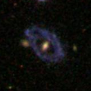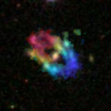 Fig.1. The SPRC-7 galaxy. Left: a combination of images in the g, r, i filters from the SDSS. The polar ring, surrounding the central lenticular galaxy is distinguished by its blue color due to the significant contribution of young stars. Middle: the SDSS image is combined with the velocity field of ionized hydrogen from the observational data of the 6-m BTA telescope: the colors correspond to the observed radial velocities (the blue dots are approaching us, the red ones are moving away from the observer), the intensity is scaled in accordance with the brightness distribution in the H-beta emission line. Right: the distribution of the gravitational potential of the dark halo according to the numerical calculations. The central disk and the polar ring are shown schematically.