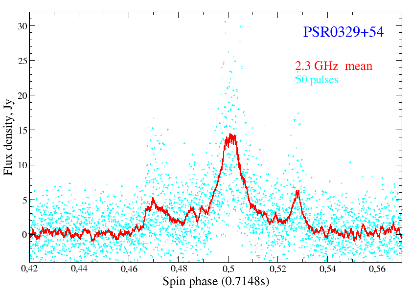Average impulse profiles of the pulsar PSR0329+54 at 2.3 and 4.7 GHz as observed in June 2017.