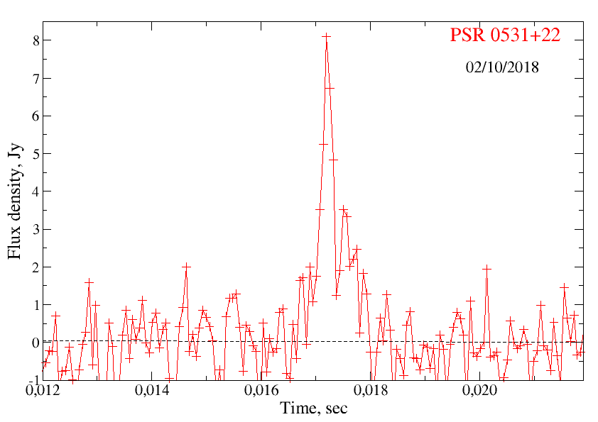 The GI found in the observations on October 2, 2018 consisted of two sub-impulses with a flow of about 8 and 4 Jy and a duration of 300 ╣s separated by 400 ╣s.