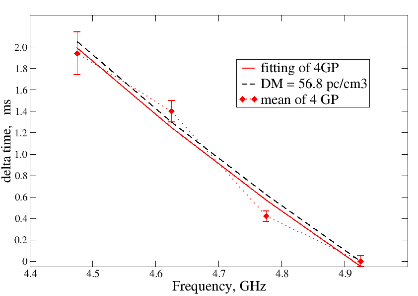 Dependence between the arrival time of four giant impulses and the frequency in comparison with the calculated dependence for the known dispersion.