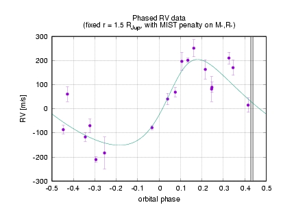 Doppler measurements from the FFOREST spectrograph with the orbital curve of the best model, the phases corresponding to the transit are marked with a gray rectangle.