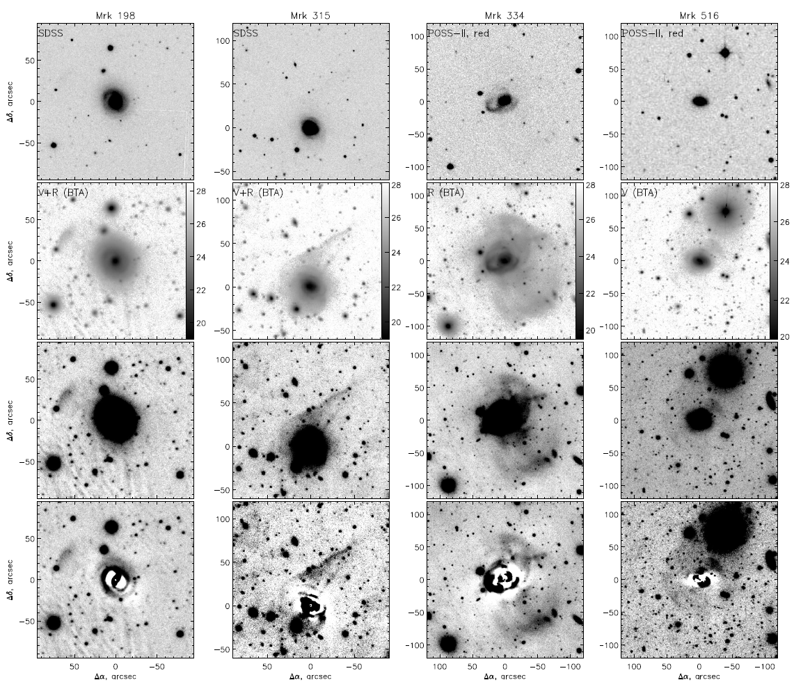 Рис.1. Сверху вниз: изображения из цифрового обзора неба; глубокие изображения, полученные на 6-м телескопе САО РАН, в шкале звездных величин и в линейной шкале, и остаточные изображения после вычитания симметричной модели распределения поверхностной яркости. |