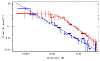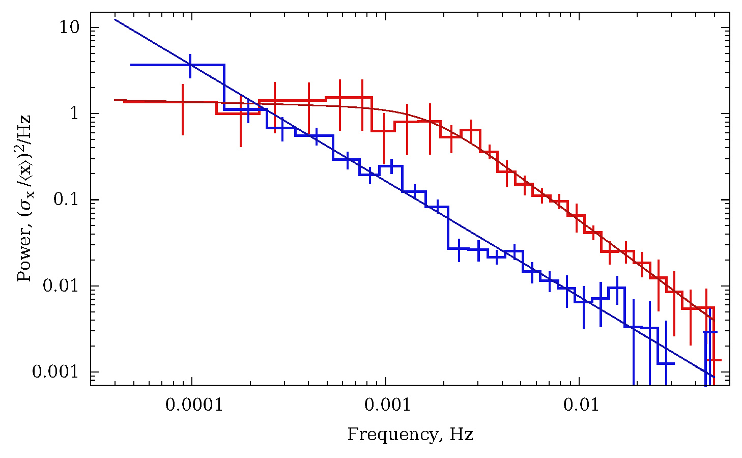 Рис.2. Наблюдаемые спектры мощности рентгеновского излучения в разных ориентациях аккреционного диска и канала: максимальное раскрытие диска в сторону наблюдателя (красный) и диск с ребра (синий). Когда диск раскрыт на наблюдателя (красный), мы видим канал, здесь мы обнаружили плоский участок. Когда диск и канал полностью закрыты (синий) мы видим только отраженное излучение от облаков, находящихся высоко над каналом. Frequency это частота в Герцах (0.001 Гц соответсвует периоду 1000 секунд).