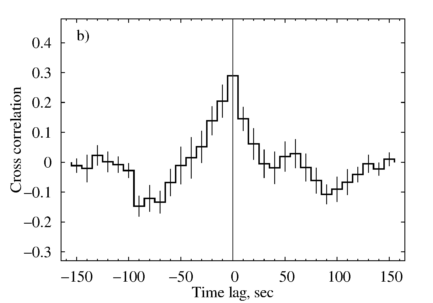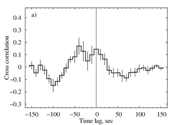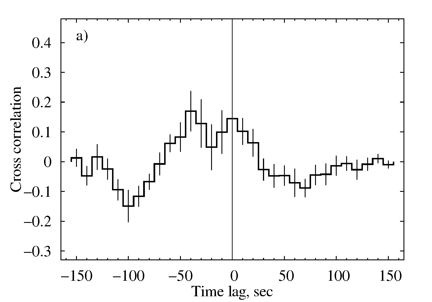 Рис.3. Корреляционные функции рентгеновского излучения между мягким рентгеновским диапазоном и оптическим диапазоном (a), а также между жестким рентгеновским диапазоном и оптическим (b). Мягкое излучение (a) образуется в струях, струи движутся со скоростью четверть скорости света, поэтому они на 50 секунд появляются позже из-за края воронки (канала), чем отраженное оптическое излучение. Жесткое рентгеновское и оптическое излучение (b) движутся со скоростью света, они одновременно отражаются от стенок воронки. Мы видим только отраженный свет, основной источник находится глубоко на дне канала.