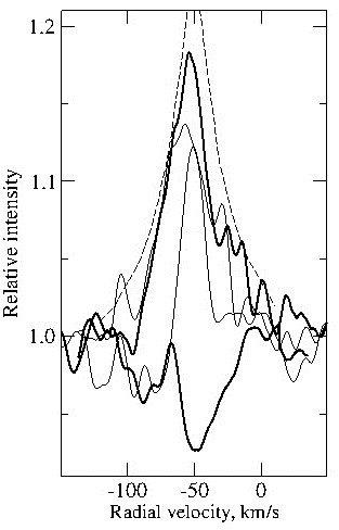 Примеры вариаций формы и положения профилей приведены на рис.2 и 3. По положению симметричных и стабильных профилей запрещенных эмиссий впервые определена системная скорость источника Vsys=-50.5 км/с. Сложная картина переменности поля скоростей (пример на рис.4) обусловлена проявлением пульсаций, скрытой двойственности звезды и изменениями абсорбционных составляющих профилей из-за вариаций геометрии и кинематики в основании ветра. Спектр объекта является уникальной природной лабораторией для изучения физических и кинематических особенностей атмосферы, расширяющейся оболочки и переходных структур.
