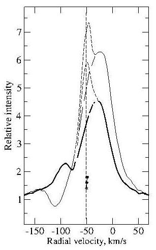 Рис.3. Вариации профилей Hα в спектрах IRAS01005+7910 (тонкая линия - 9.03.2004, жирная - 18.01.2005). Штрихи - оболочечные эмиссии. Вертикальная штриховая - скорость по запрещенным эмиссиям