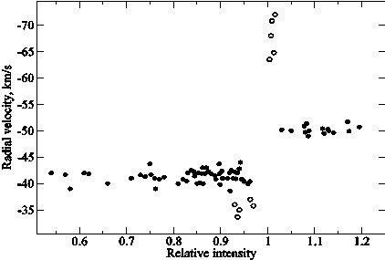Рис.4. Зависимость Vr(r) в спектре IRAS01005+7910 за 29.05.2013. Точки - запрещенные эмиссии (r>1) и абсорбции HeI и ионов (r<1). Открытые кружки - эмиссионные (Vr <-60 км/с) и абсорбционные (Vr > -40 км/с) компоненты профилей линий FeIII.