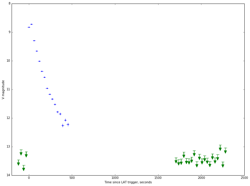 Система также среагировала на второй GBM триггер 488587880 с несколько отличающимися координатами, которые, благодаря большому полю зрения, снова в него попали. После этого было накоплено еще 20 кадров в интервале от T0+1691 до T0+2264 с. В этой выборке отсутствовали новые объекты ярче V=13.5.