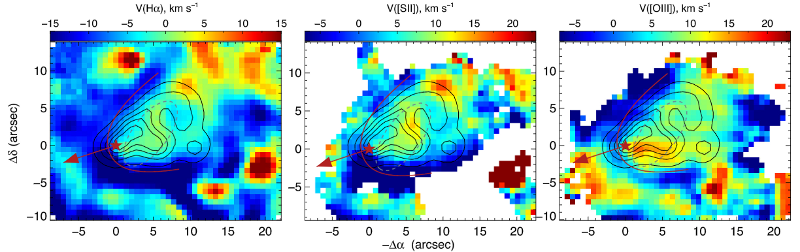 Рис.1. Данные наблюдений туманности "Foot Nebulae" на 6-м телескопе САО РАН. Показаны поля лучевых скоростей в эмиссионных линиях ионизованного водорода (слева), серы (в центре) и кислорода (справа), шкала скоростей указана сверху изображений. Контуры отмечают распределение яркости в линии ионизованного водорода, звездочка - положение ULX, пунктирный эллипс - звездное скопление. Красной кривой показана форма модельной головной ударной волны, вызванной движением ULX из центра скопления в направлении, показанном стрелкой