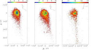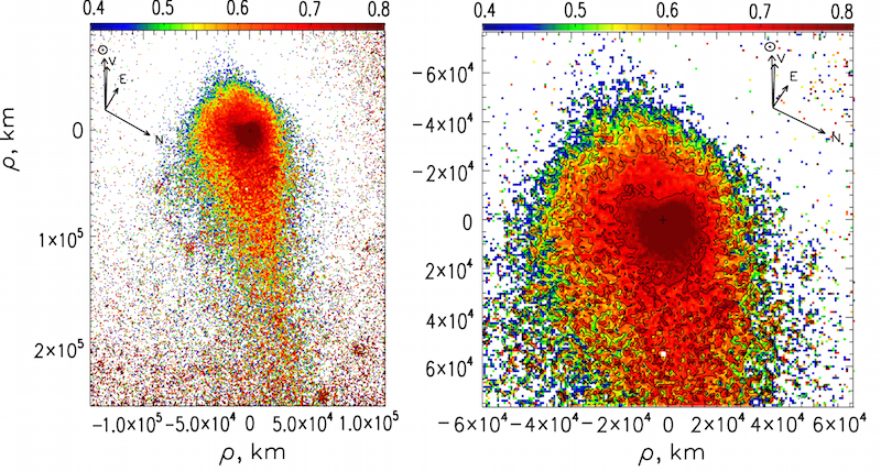Радиальные профили поверхностной яркости значительно различаются для комы, струй и хвоста. Эти результаты говорят о неизотропном выбросе пылевых частиц, как со всей поверхности ядра, так и из локальных областей на ядре. Цвет пыли в структурах, а также в хвосте заметно краснее, чем окружающая кома, что связано с наличием крупных частиц или/и частиц разного состава, богатых органическими веществами. Резкое уменьшение яркости на больших расстояниях от кометного ядра, также подтверждает наши результаты о наличии в кометной коме больших медленно движущихся частиц. Анализ карты цвета указывает на сосредоточение крупной пыли вблизи ядра, а также доминирование малых быстродвижущихся пылинок на периферии кометной комы.