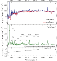 Рис.3. Спектр кометы 67P, полученный 8 ноября 2015 г.: a - наблюдаемый спектр кометы с наложенным континуумом; b - спектр излучения; c - полиномиальная поправка к спектру Солнца