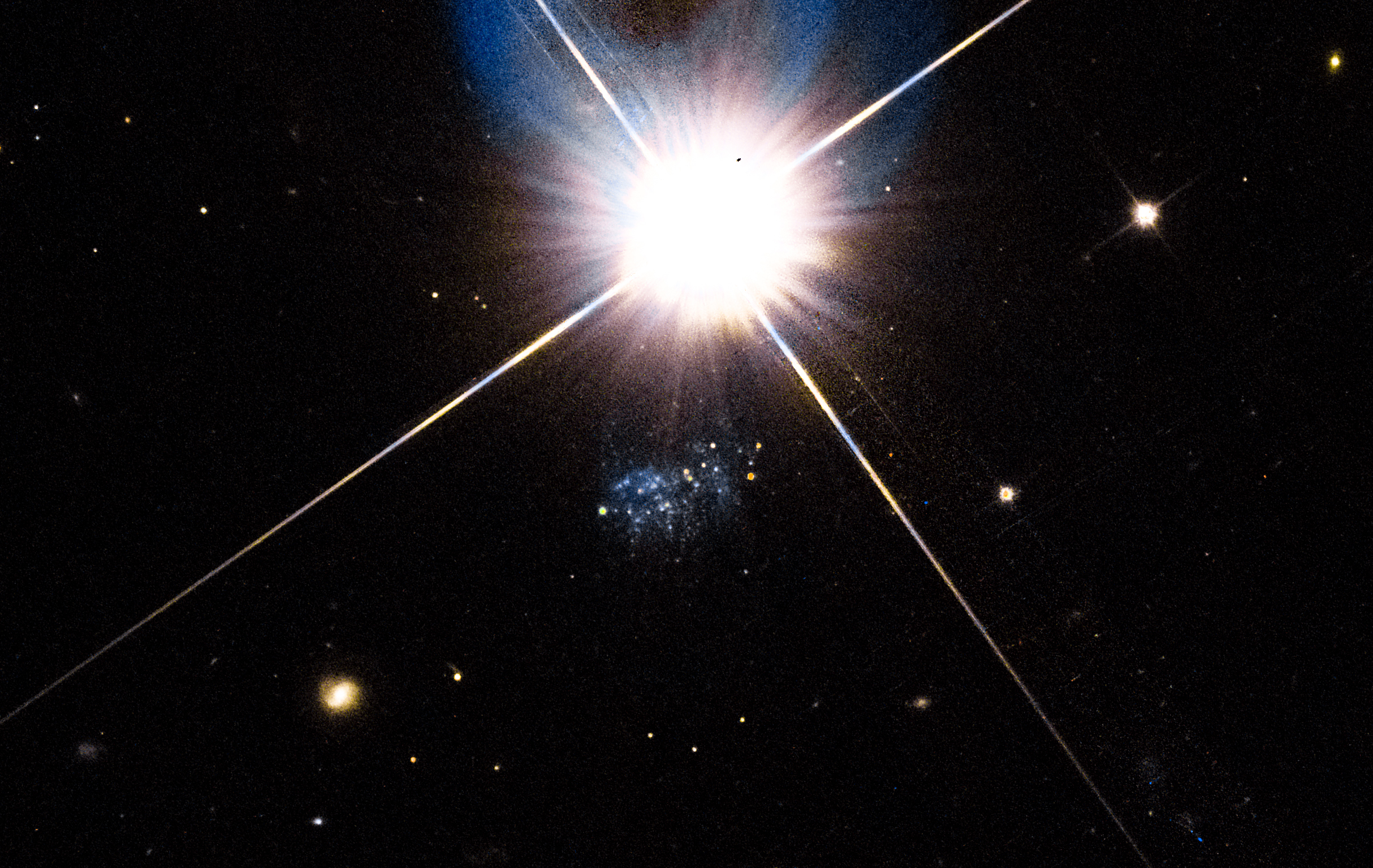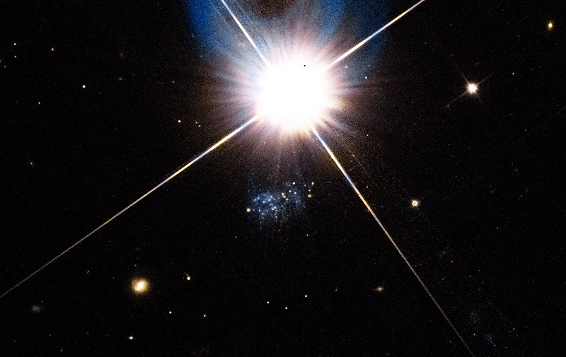 Обнаружена близкая карликовая галактика с рекордно низким содержанием тяжелых химических элементов. Богатая газом галактика HIPASS J1131-31 с лучевой скоростью 716 км/с была детектирована как источник излучения в линии нейтрального водорода в обзоре южного неба на Паркском радиотелескопе. Она была разрешена на отдельные звезды в наших наблюдениях на космическом телескопе Хаббла (см. Рис. 1). Галактика скрывалась в ореоле яркой звезды и поэтому была названа «спрятанной» (Peekaboo). Карликовая галактика «Пикабу» расположена на окраине группы галактик на расстоянии 6.8±0.7 Мегапарсека от нас. Старые звезды ветви красных гигантов у галактики малочисленны по сравнению с молодым звездным населением, что указывает на молодой возраст галактики, около 1-2 миллиардов лет. Cпектральные наблюдения на 10-метровом Южно-африканском телескопе показали, что эта голубая карликовая галактика является экстремально бедной тяжелыми элементами с содержанием кислорода менее 2% солнечного. Близость обнаруженной галактики делает ее важным объектом для дальнейшего изучения космического обилия химических элементов и природы молодых галактик.