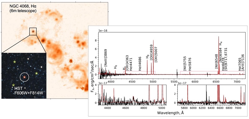 С помощью 6-м телескопа САО РАН обнаружена интересная звезда в галактике NGC 4068. Массивные звезды оказывают значительное влияние на газовую среду галактик, за короткое время выбрасывая в нее огромное количество энергии в виде излучения, звездного ветра и ударных волн. Они, в первую очередь, ответственны за обогащение Вселенной тяжелыми элементами. Поэтому представления об эволюции галактик и Вселенной в целом тесно связаны с пониманием процессов, происходящих с массивными звездами. При этом их ключевые параметры (масса, скорость ветра, время жизни), а значит и воздействие на межзвездную среду, в значительной степени зависят от содержания в них тяжелых элементов.