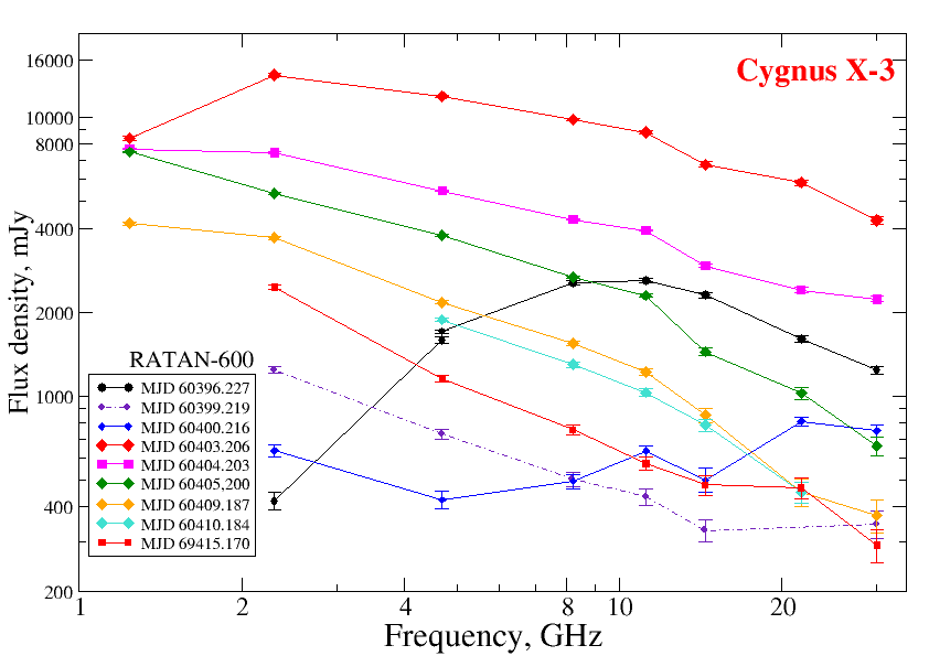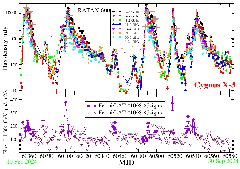 В 2024 году в ходе многочастотного (1-30 ГГц) мониторинга на радиотелескопе РАТАН-600 мы зарегистрировали пять гигантских (с потоком выше 10 Ян) вспышек от рентгеновской двойной Cyg X-3. Такая активность объекта довольно редка, если не сказать, уникальна, например, в 2021-2023 годах не было зарегистрировано ни одной вспышки. Начало всех пяти вспышек было однозначно связано с регистрацией значимого гамма-излучения в диапазоне 0.1-300 ГэВ (данные космической обсерватории Fermi). С другой стороны, все вспышки произошли во время перехода системы из гипер-мягкого рентгеновского состояния в жесткое состояние, то есть когда от почти нулевого значения поток жесткого рентгеновского излучения (15-50 кэВ) заметно поднимался, а поток мягкого излучения 4-10 кэВ (данные японской установки MAXI на МКС) падал. Такое поведение мы объясняем в рамках физической картины с меняющимся и, как недавно было выяснено (Veledina et al., 2024), сверхкритическим темпом аккреции вещества на черную дыру, вариациями состояния короны и аккреционного диска и изменениями процесса коллимации струйных выбросов. Хотя радиовспышки эволюционировали на разной шкале от 10 до 60 дней, они обладали похожими свойствами: вначале поток рос линейно от времени, а радиоизлучение было оптически толстым на частотах ниже 2 ГГц, после максимума вспышки происходило экспоненциальное затухание с постепенным «смягчением» спектра (спектральный индекс менялся от -0.1 до -0.9 на высоких частотах). На рис.1 из кривых блеска Cyg X-3 в гамма-лучах и в радиодиапазоне ясно видно, что гамма-излучение коррелирует с началом радиовспышек, и задержка меньше одного дня. На рис.2 представлены спектры начала вспышки в марте-апреле с характерным завалом на частотах ниже 3 ГГц, вероятно обусловленным или синхротронным самопоглощением или тепловыми электронами в джетах. Все вспышки были исследованы в новом режиме быстрых перестановок на антенной системе Южный сектор с плоским отражателем РАТАН-600 САО РАН на двух частотах 4.7 и 8.2 ГГц. Впервые удалось обнаружить и исследовать спектральную и временную переменность Cyg X-3 на временах от 9 до 300 минут.