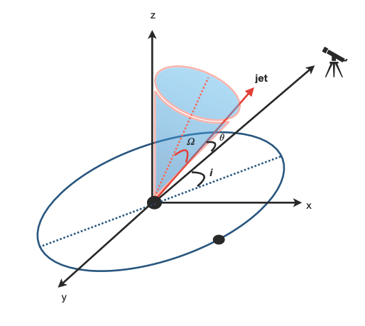 Двойная сверхмассивная чёрная дыра показана двумя чёрными точками, струя — красной стрелкой, угол между ней и линией зрения наблюдателя равен θ, угол наклона орбиты относительно наблюдателя равен i, а угол прецессионного конуса равен Ω.