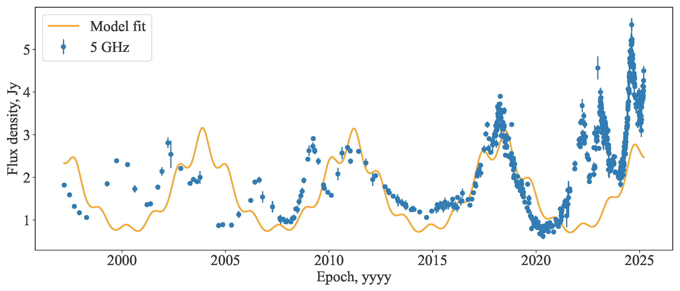 Статистическая обработка данных позволила выявить наличие нескольких периодических компонент с характерным временным масштабом переменности — от 1.4 до 7.5 года. Эти значения согласуются с результатами предыдущих исследований, выполненных в отдельных диапазонах энергий. Для интерпретации полученных данных была рассмотрена модель двойной сверхмассивной чёрной дыры в центре Ton 599 c массой 5×108ⵙ (Рис. 3). Расчёты показывают, что наблюдаемая картина хорошо описывается системой с орбитальным периодом порядка 1.2-1.7 года и прецессией струи с периодом около 5.8-7.7 лет (Рис. 4). А более быстрая переменность — на масштабах дней и недель, а также мощные кратковременные вспышки, вероятно, связаны с компактными областями излучения внутри струи, возникающими в зонах ударных волн, где происходит дополнительное ускорение частиц. Таким образом, сложная многоволновая переменность Ton 599, по-видимому, объясняется сочетанием геометрических эффектов, связанных с изменением ориентации струи относительно наблюдателя, и быстрых физических процессов, происходящих в самой струе.