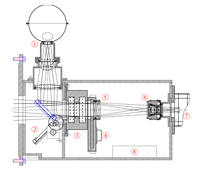 Рис.1. Общий вид MaNGaL в фокусе Кассегрена телескопа Цейсс-1000 (слева) и его оптико-механическая схема: (1) - узел калибровки, (2) - диагональное зеркало, (3) - сканирующий ИПФ, (4) - среднеполосные фильтры, (5) - линза поля, (6) - камерный объектив, (7) - ПЗС, (8) - компьютер управления.