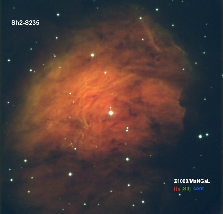 Прибор MaNGaL предназначен для получения узкополосных изображений протяженных объектов в фокусе Кассегрена (f/13) метрового телескопа Цейсс-1000. Прибор собран по схеме афокального редуктора, итоговая светосила на 1-м телескопе: F/5.3. Полоса пропускания формируется с помощью сканирующего пьезоэлектрического интерферометра Фабри-Перо (ИФП) ET-50 (производство IC Optical Systems Ltd, Великобритания). Профиль полосы пропускания - лоренцевский со средней FWHM=13 Å (может настраиваться в пределах ± 3 Å). Центральная длина волны фильтра может быть любой в диапазоне 4600-7500ÅÅ. Калибровка шкалы длин волн выполняется с помощью встроенной лампы с He-Ne-Ar наполнением, контроллер CS-100 позволяет устанавливать её с точностью около 0.4Å. Расстояние между пиками пропускания ИФП в соседних порядках интерференции составляет 170-430ÅÅ, поэтому предварительная монохроматизация выполняется с помощью среднеполосных фильтров производства Edmund Optics с шириной полосы 10-25 nm. Детектор - ПЗС-камера с азотным охлаждением на базе чипа SI-003A TK1024, форматом 1024x1024 пикселей. Обычно считывается фрагмент 780x780 пикселей, ограниченный диметром светофильтра.